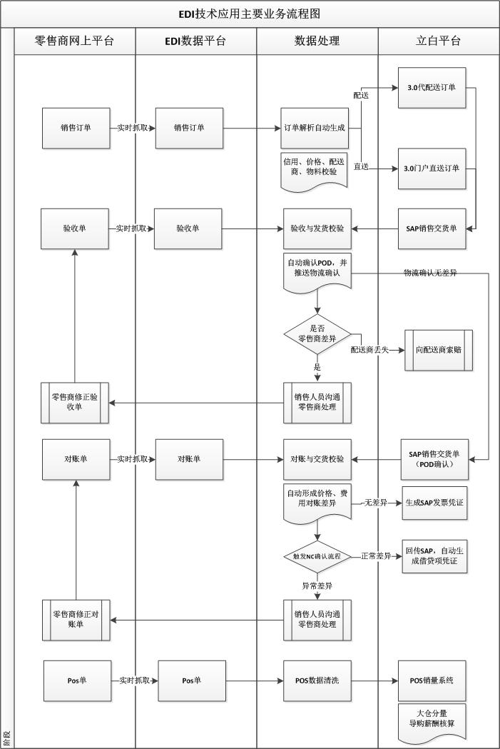 現(xiàn)代渠道訂單處理目前是由訂單文員通過(guò)人工登錄門店網(wǎng)站下載訂單,再轉(zhuǎn)換為直營(yíng)訂單或經(jīng)銷商代配送訂單,訂單下載效率低并且占用大量的人力資源;利用EDI訂單自動(dòng)下載功能,實(shí)現(xiàn)24小時(shí)無(wú)人值守訂單自動(dòng)下載,確保訂單數(shù)據(jù)的實(shí)時(shí)同步,提升現(xiàn)代渠道整體配送效率;價(jià)格異常訂單自動(dòng)校驗(yàn),維護(hù)集團(tuán)價(jià)格形象,完全規(guī)避未獲得公司審批的低價(jià)訂單被送貨的風(fēng)險(xiǎn)。