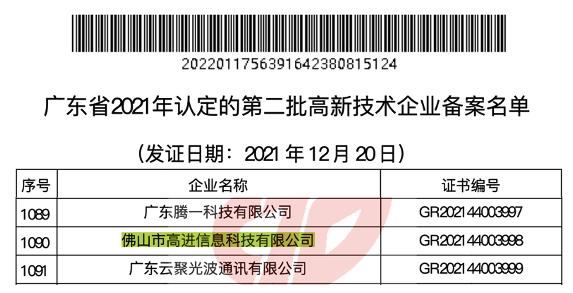 根據(jù)《高新技術(shù)企業(yè)認(rèn)定管理辦法》(國(guó)科發(fā)火〔2016〕32號(hào))和《高新技術(shù)企業(yè)認(rèn)定管理工作指引》(國(guó)科發(fā)火〔2016〕195號(hào))有關(guān)規(guī)定,在經(jīng)過(guò)各級(jí)審核以及專(zhuān)家評(píng)審之后,廣東省認(rèn)定管理機(jī)構(gòu)2021年認(rèn)定的第二批5639家高新技術(shù)企業(yè)備案,我公司順利通過(guò)。